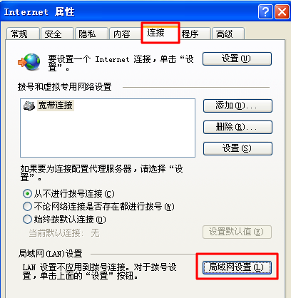 2、选择“链接”选项卡,并单击底部的“局域网设置”按钮。如图所示: