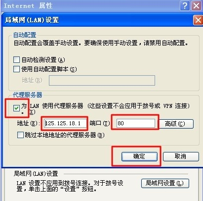 3、在“局域网设置”对话框之中,在“为LAN应用代理服务器(这些设置不会利用于拨号或 vpn链接)”之前打上√。然后在地址和端口这里填写你筹备好的信息即可。如图所示: