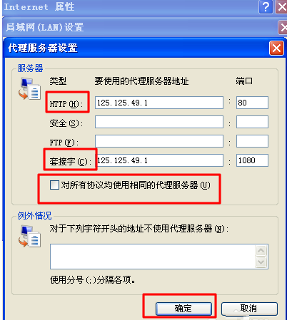 4、经过以上的设置之后,基础上可以暗藏自己的ip了,但是还没彻底暗藏,想要彻底暗藏可以在“局域网设置”对话框之中,点击“高级”按钮,弹出“代理服务器设置”对话框如图所示: