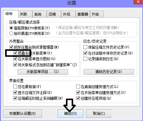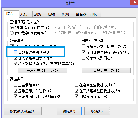 3、弹出设置对话框,在设置的综合选项卡下的外壳整合里有“层叠右键关联菜单”子选项,默认是未勾选的,如下图所示