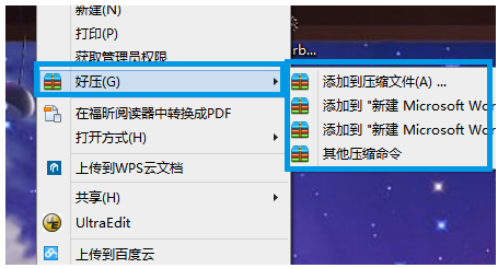 5、再看右键菜单,好压所有的压缩命令都合并到一个菜单“好压”下了,其他压缩软件类似的方法即可将压缩命令合并。