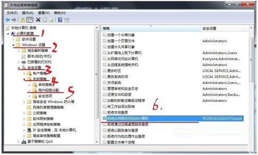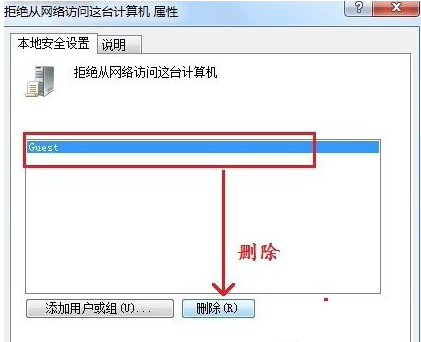3、删除用户权限分配选项中的“拒绝从网络访问这台盘算机”中的Guest用户或组,并利用。