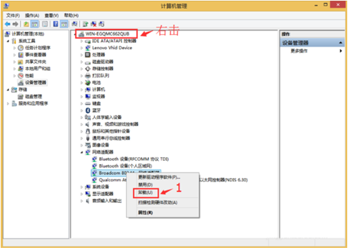 1、我的电脑右击—管理—设备管理器—网络适配器—选中你的无线网卡(wireless LAN)右击卸载,如图“卸载无线网卡”(win7系统在弹出的对话框不要打勾直接断定)