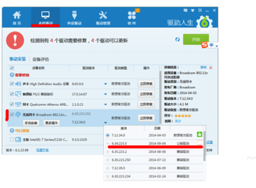 四、升级无线网卡驱动,这种情况针对笔记本应用已经有一段时间(差不多2年以上),但是没有手动更新过无线网卡的盆友。度娘下载驱动人生(注意他的捆绑软件)——本机驱动——无线网卡——选择最新更新——立即修复,安装完成之后打开共享精灵软件正常应用。