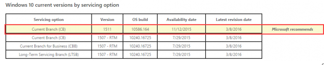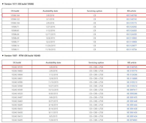 在对外正式公开发行的系统中,微软当前正在掩护10586(1511)和10240(1507-RTM)两套BUILD,最新版分辨为10586.164(KB3140764)和10240.16683(KB3135174),10586版本只有CB分支,10240有CB,CBB,LSTB三个分支,微软强烈推荐了10586.164。