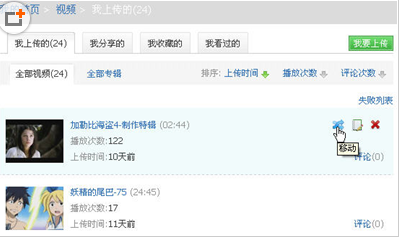 4、在“我的上传”或“已上传”列表,右键快捷菜单点击“查看我上传的视频”到我上传的全部视频列表页。对上传成功的视频,可以进行移动、编辑、删除操作。