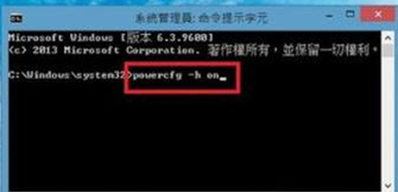 2、重新启动电脑,再在菜单点运行,输入cmd,然后在命令符窗口输入powercfg -h on,重新打开休眠功效。
