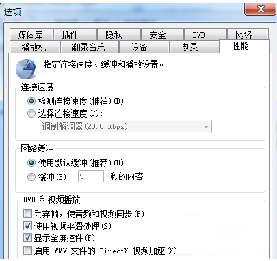 3、接着在选项窗口中,切换到性能项中,取消勾选“启用WMV文件的DirectX视频加速”。