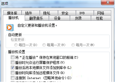 4、然后再切换到“播放机”窗口中,主动更新若可以修正,则改为每月一次。接着分辨取消勾选播放机设置中的“播放时容许运行屏幕掩护程序”和“播放时向库添加远程媒体文件”两项。