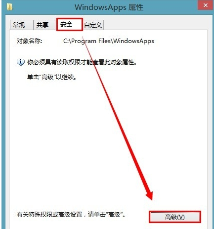 2、进入该文件夹的属性设置界面中依次点击【安全】----【高级】