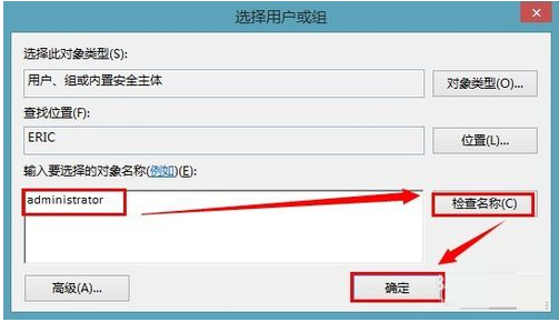 4、输入要选择的对象名称框下面输入administrator 再点击【检查名称】----【断定】