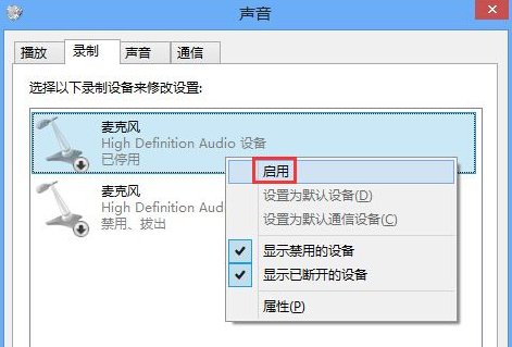 2、在已停用的麦克风设备上,点击鼠标右键,选择启用,即可启用麦克风设备,如图: