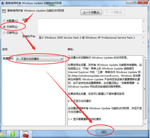 4、双击删除应用所有Windows update功效的访问权限,弹出选项卡,设置为:已启用。配置通知设置为不显示任何通知。断定后应当不会涌现上述问题了。