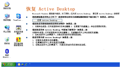 Active desktop可以在桌面显示WEB的内容,包含图片和链接等,不过,很多用户很少会遇到该功效。最近,有些XP系统用户创造桌面变白还提示还原Active Desktop,具体如下图所示。那么,桌面提示还原Active Desktop怎么关闭或者取消呢?下面,一起来看具体关闭方法吧。