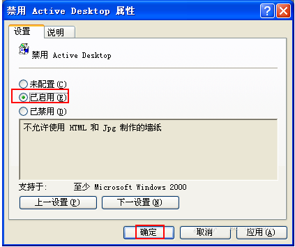 3、双击“禁用Active Desktop”项,打开“禁用Active Desktop属性”对话框: