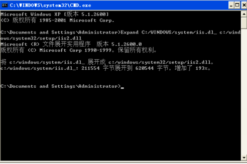3、在iis6.0安装包中找到iis.dl_和iis.in_两个文件,一起拷到目录(C:/WINDOWS/system)。用cmd输入Expand命令解开iis.dl_和iis.in_格式为: