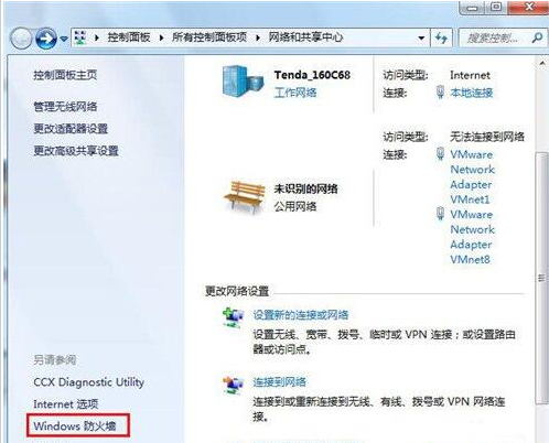 1、打开“把持面板”->“网络和共享中心”界面,点击“Windows防火墙”按钮;
