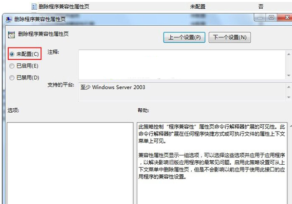 3、在窗口右侧找到“删除程序兼容性属性页”,选择“未启用”或“禁用”,点击利用并断定即可解决问题。