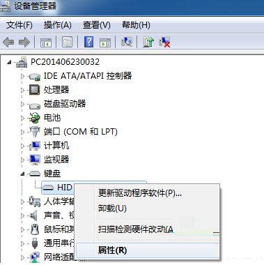 2、点击一下键盘前面的小三角形符号,可以看到键盘下面的对应驱动,在该驱动上通过鼠标右键单击一下,选择属性项,打开键盘驱动更新页。
