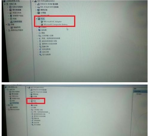3、开机后,右键点击“盘算机”——选择“管理”——点击“设备管理器”——点击”电池“选项——卸载其中的”Microsoft ACPI Compliant Control Method Battery“。