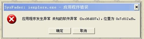 最近,有些用户在Win7系统中打开网页正要看娱乐科技消息时创造浏览器会涌现提示:“SysFader:iexplore.exe-利用程序毛病,利用程序产生异常,未知的软件异常(0xc06d007e)”,具体如下图所示。其实,这问题是由于Dll文件出错或IE浏览器涌现问题,下面,小编就针对此问题来和大家总结了三种方法。
