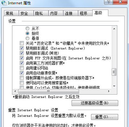 打开浏览器,选择工具—Internet选项,选择高级选项卡,将设置中的启用第三方浏览器扩大选项取消,重启浏览器即可。