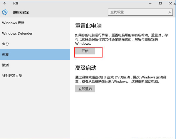 3、然后选择“恢复”选项,这时我们就可以看到 “重置此电脑”的选项了,单击“开端”进行重置‘;