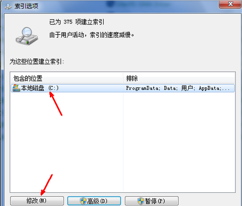 2、打开索引选项后,在包含的地位这个列表中,显示了电脑上所有已经建立索引的文件夹或者地位。现在列表中只有一个C盘,阐明在C盘中是有索引程序在不断地检索文件的,我们要删除C盘的索引,就点击左下角的修正按钮。