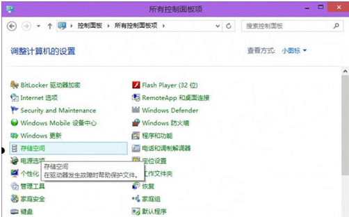 2、在把持面板中,将查看方法设置为小图标,然后找到“储存空间”点击进入;