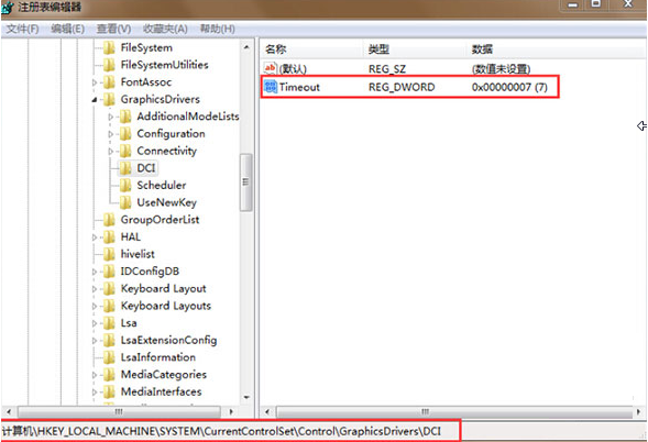 2、然后定位到以下项:HKEY_LOCAL_MACHINE\SYSTEM\CurrentControlSet\Control\GraphicsDrivers\DCI,然后在右侧窗口中找到并双击“Timeout”