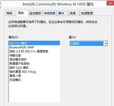 在“设备管理器”中找到无线网卡“属性”中“高级”下“802.11n模式”的值改为“已禁用”,保存后重启网卡即可解决。