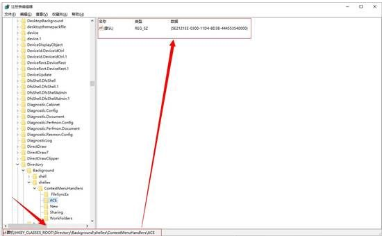 2、定位到:\HEKY_CLASSES_ROOT\directory\background\shellex\contextmenuhandlers\ace项,找到默认值;