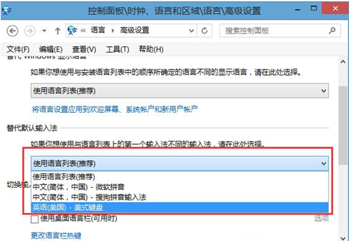 5、然后点击“高级设置”,进入后将替代默认输入法设置为“美式键盘”;