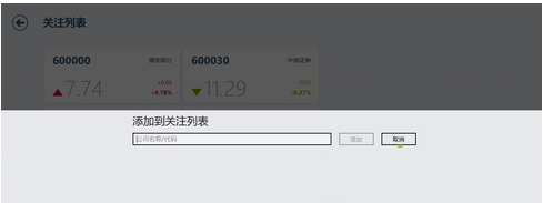 3、输入公司名/代码添加新条目,这时,用户除了能够在打开财经利用之后直接看到自己关注的财经信息,还能直接在开端屏幕的磁块上看到证券信息的滚动播放。