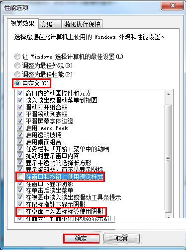 4、选择【自定义】→不勾选【在窗口和按钮上应用视觉样式】和【在桌面上为图标标签应用暗影】。