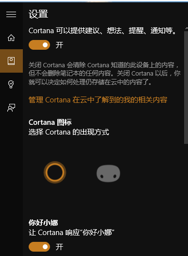 2、然后在弹出的设置界面中在Cortana相应 “你好小娜”的地位设置为 “开”,这样只要确保登录微软账户,并确保电脑的麦克风工作正常,那么只要对着电脑说 “你好小娜”,Cortana就会弹出,并凝听您要说出的指令;