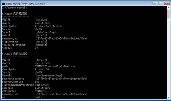▲在命令提示符中输入bcdedit回车,你会看到上图所示的成果,找到名为resumeobject的条目,记载下后面的一长串字符(即GUID)。