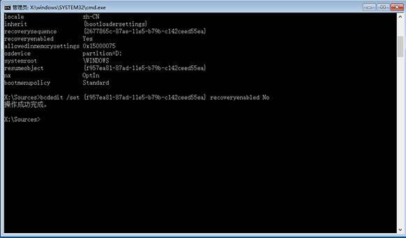 ▲接着输入bcdedit /set {GUID} recoveryenabled No回车运行,运行该命令后就会暂时禁用系统的主动启动修复功效,其中的{GUID}即为上一步中记载的字符。