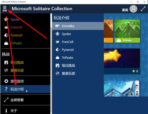 5、点击左上角的按钮,弹出菜单,选择玩法介绍,查看每种纸牌游戏的玩法;如下图所示