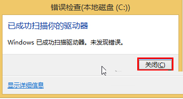 6、Win8磁盘检测扫描驱动器完成后,点击“关闭”按钮,如下图所示: