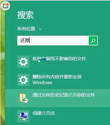 1、按下Win+Q组合键,在涌现的Charm栏搜索框中输入“还原”,在涌现的选项中点击“通过文件历史记载还原你的文件”。