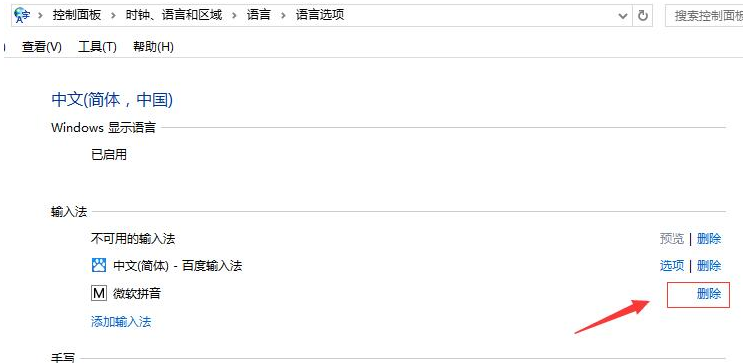 3、依次打开“语言”—“语言选项”,然后微软输入法,点击后面的删除,单击保存即可。