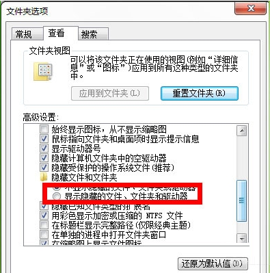 一、双击打开“盘算机”,然后选择“工具”,再点“文件夹选项”,选择查看,选中显示暗藏的文件、文件夹和驱动器。