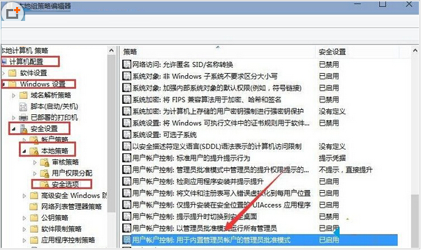 3、双击打开“用户帐户把持:本地账户的管理员批准模式”然后设置为“已启用”并保存;