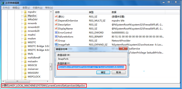 2、按“Windows+R”输入“regedit”回车打开注册表,并定位到HKEY_LOCAL_MACHINE\SYSTEM\CurrentControlSet\services\MpsSvc,确认ImagePath的数值数据是否雷同,如“%SystemRoot%\system32\svchost.exe -k LocalServiceNoNetwork”。