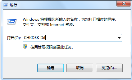 4、扫除系统磁盘,“运行”窗口中,我们输入CHKDSK D:f命令,即可清算系统磁盘,恢复磁盘的正常应用。