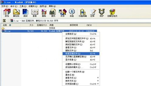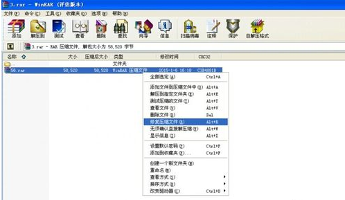 4、点选压缩文件后,我们右键一下,然后点击下拉菜单中的”修复压缩文件“。