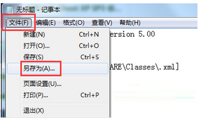注意,粘贴进去之后,需要点击记事本文档上方窗口中的文件-另存为,然后将该文件保存为.reg格式的文件,例如小编这里设置的1.reg。