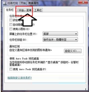2、在开端菜单属性中点击“开端菜单”选项卡;