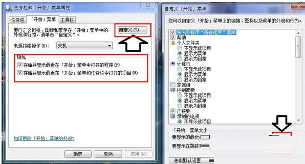 3、将隐私下面的“储存并显示最近在开端菜单中打开的程序”和“储存并显示最近在开端菜单和任务栏中打开的项目”打钩,点击利用,然后点击“自定义”,将底部的“要显示最近打开过的程序程序的数目”设为大于0的数字,如果此处设为0,在开端菜单中也无法显示打开过的程序。